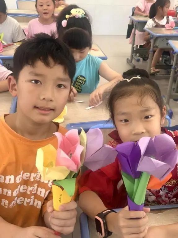 美术课堂宛如缤纷的调色盘,每个班级各展所长。小学的教室内,1班小朋友用画笔赋予曾侯乙编钟童趣纹样,2班折出朵朵 “小红花” 绽放温暖,3班用粘土捏塑出奇幻星球,4班以线条重现青铜纹饰的历史韵律。孩子们用稚嫩的双手创造着充满想象力的作品,课堂上洋溢着活泼的笑语与创意的火花。