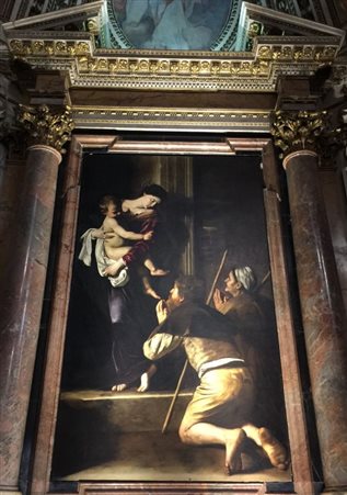 下午,老师决定带写生小组感受一下罗马的古代建筑与卡拉瓦乔的绘画作品。从酒店出来不远处就是地铁站,乘坐地铁到圣母堂附近,参观卡拉瓦乔的《圣彼得上十字架》以及《圣保罗之光》。卡拉瓦乔讲究画面的单一光源与深色背景互相烘托,营造强烈的光感以及深沉的气氛。这种具有戏剧感和真实感的绘画形式如同一柄利剑划破天空,为欧洲油画带来了巨大的震撼与启发。接着,实习小组继续步行到圣奥古斯丁教堂,这里存放着卡拉瓦乔《洛莱托的圣母》。图中圣母抱着小耶稣接受朝拜,画面光线明暗感强烈,人物的神态动作逼真自然,仿佛不在画中,而在眼前。最后一幅画是位于圣王路易教堂的《圣马太蒙召》,一束天光由右侧打来,辛苦一年突然蒙受耶稣召唤的圣马太面容充满了惊喜与激动,而在一旁忙着清点辛苦工作所得报酬的劳工,却没注意到耶稣亲临。由画面传达的这种身临其境的真实感,令同学们久久回味,不愿离去。