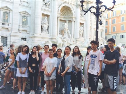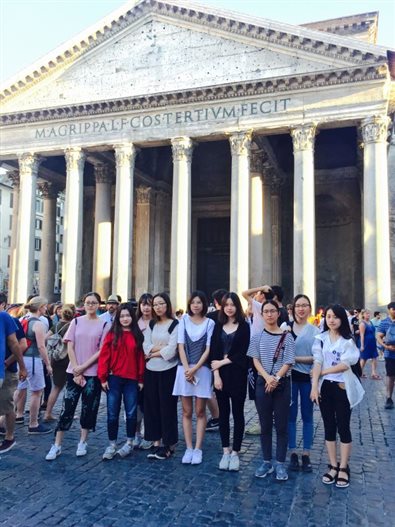 而后,大家徒步经过正在维修的旋转教堂、人来人往的人民广场,来到了罗马最古老的建筑,也是唯一的罗马帝国时期的神庙——万神殿。其宏伟雄壮被米开朗基罗称赞为“天使的设计”。万神殿前人流涌动,他们从世界各地前来,膜拜这座如神迹般矗立千年的伟大建筑。同学们也难掩心中激动,纷纷拍照留念。离万神殿不远处就是被国人熟知的特莱维喷泉(别名:罗马许愿池)。电影《罗马假日》中就出现了这座有着浪漫传说的喷泉。
