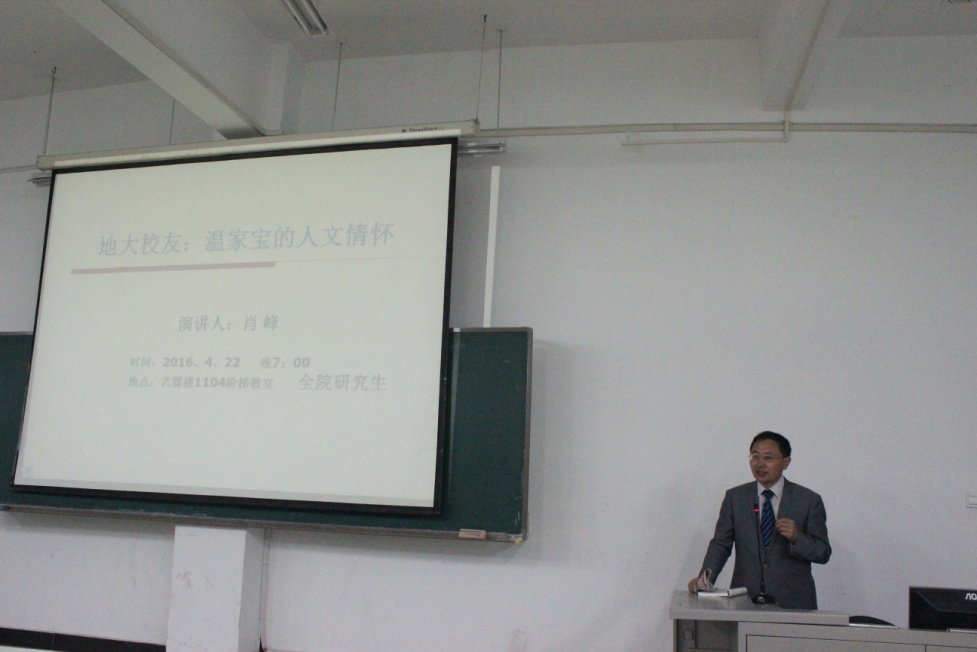 (通讯员许红梅 李铭洋 摄影刘鸣)4月22号晚7点,2016年艺术与传媒系列讲座第三讲在艺媒楼1104 教室如期举行。我院新闻传播系肖峰教授,为同学们详细讲述了地大校友温家宝的人文情怀。
