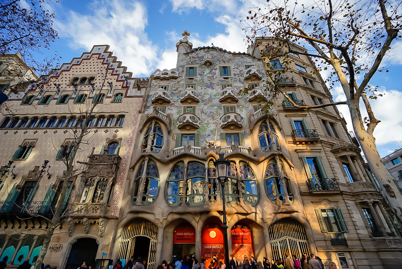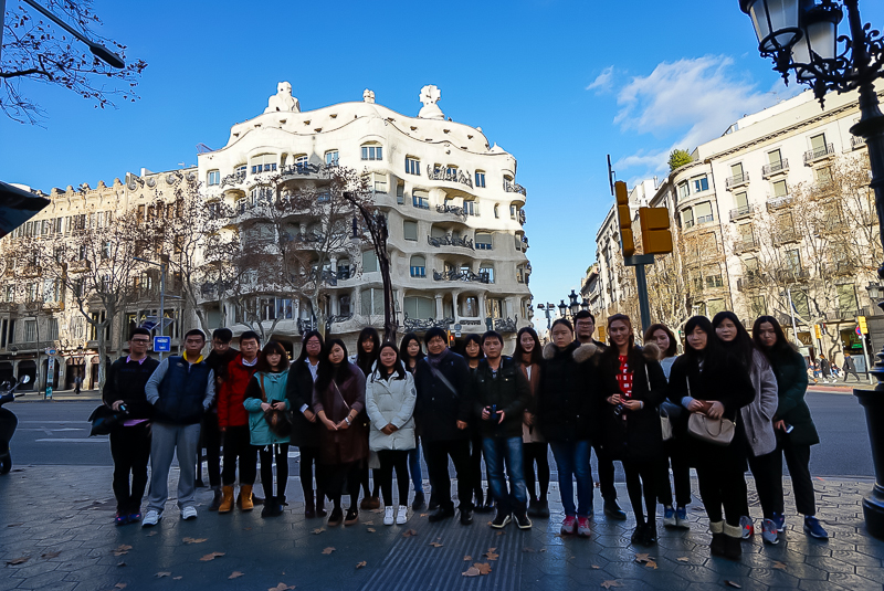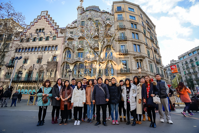 下午4点30分,访学团抵达米拉之家。米拉之家坐落于西班牙巴塞罗那格拉西亚大道,其外墙由白色的石材砌出,呈波浪形。扭曲回绕的铁条及铁板则构成了阳台栏杆和窗户。马林老师表示:“米拉之家是安东尼奥·高迪设计的最后一个私人住宅,它的外观十分独特,正如高迪所说‘直线属于人类,而曲线才属于上帝’而高迪对曲线的运用更可谓是炉火纯青”。语毕,马老师携访学团行至距米拉之家200米左右的巴特罗公寓。巴特罗公寓共有六层,同样由安东尼奥·高迪设计。而建筑本身则秉承了高迪一贯的风格,没有棱角,多用柔和的波浪形。其造型之美,令访学团成员赞叹不已,纷纷拍照留念。