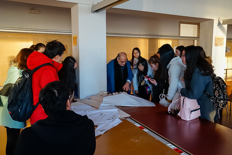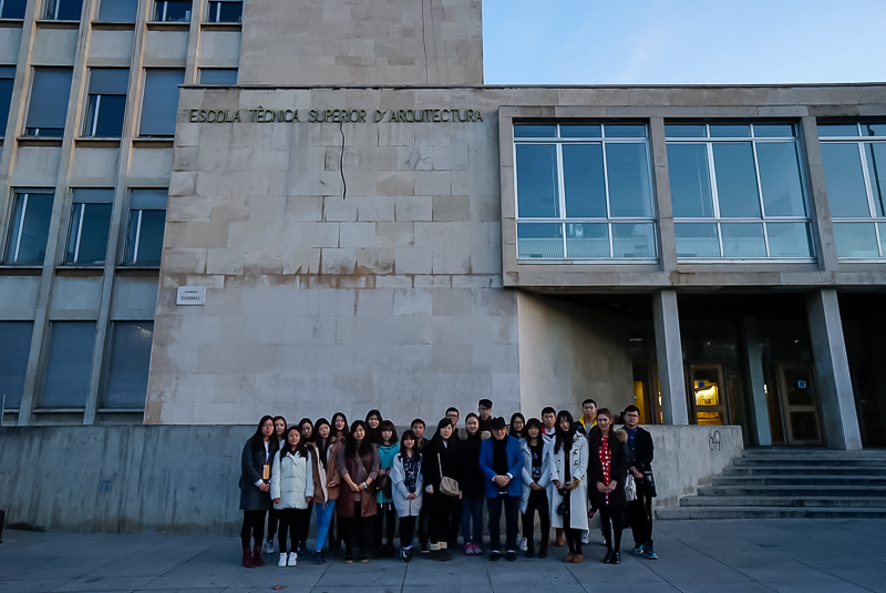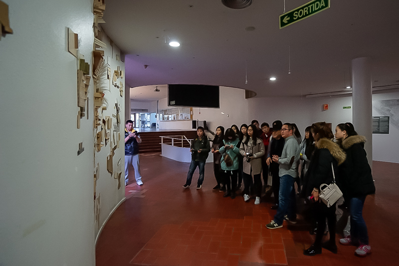 下午5点10分,访学团抵达加泰罗尼亚理工大学(以下简称UPC)巴塞罗那建筑学院。该学院共有师生约3000人,主要专业为建筑及景观设计,它是欧洲乃至世界著名的设计学院。受院长委托,建筑学院教授米歇尔(MiquelVidal Pal)接待了访学团一行,并带领访学团成员前往大学内部进行参观。米歇尔教授带领访学团来到学院一层,并在地图前向访学团介绍了巴塞罗那的地理环境及巴塞罗那建筑学院的基本状况。随后,米歇尔教授引导访学团到达第六层,参观学生的教室及设计作品,他表示:“在这所学院里,有时候,教授会要求学生做一些大的建筑模型,而这个时候通常是以小组为单位”。随后,教授又向访学团成员展示了部分学生的建筑作品。