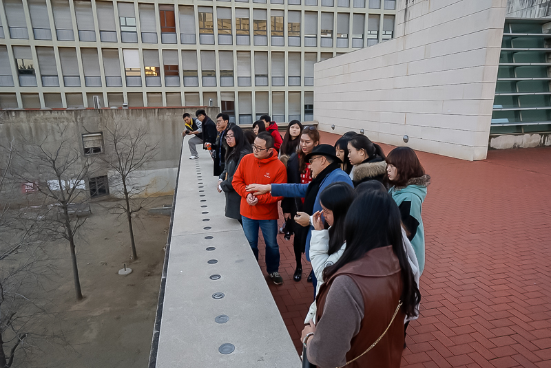 在米歇尔教授的带领下,访学团参观了整个学院。在到达学院的天台时,教授示意访学团向下俯瞰一块S型绿地,并向访学团成员介绍了自己的设计:“天台下面的这一块区域曾经被废弃,后来形成了一个土丘。而学院希望我参与土丘的设计,让它变得可利用。所以我决定将它设计成‘S’型,带有一定的曲面空间,这可以方便学院的学生,他们可以在上面休息,或坐,或躺。”其巧妙的构思赢得了访学团成员的一致好评。
