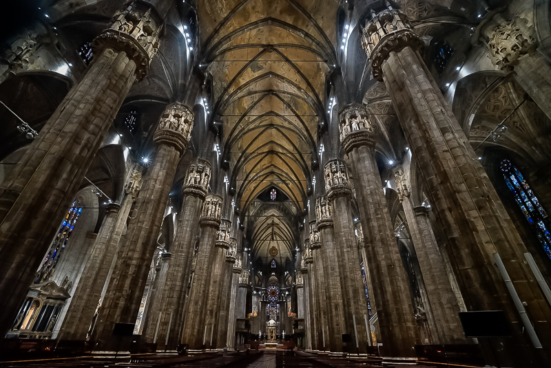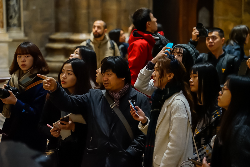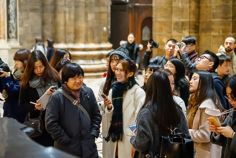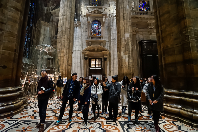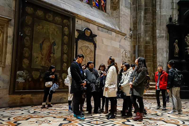 进入教堂之后,马林老师以米兰大教堂作为范本,对哥特式建筑做了简单讲解。他认为:“哥特式建筑具有:高、棱、空的特点,而其所用窗型多为长条形,从内向外看时,由于可以透光,窗子呈现出彩色;而从外向内看时,则不透光,窗子因而呈黑色。哥特式建筑多出现于法国和德国,尖顶式的设计最早是为了防止积雪,而教堂里十字架式的平面则是为了体现教堂的庄严”。讲解完毕,马林老师又带领访学团参观了米兰大教堂内最重要的圣坛及神坛,并对米兰大教堂的雏形——教堂底层的拜占庭式小教堂进行观赏。