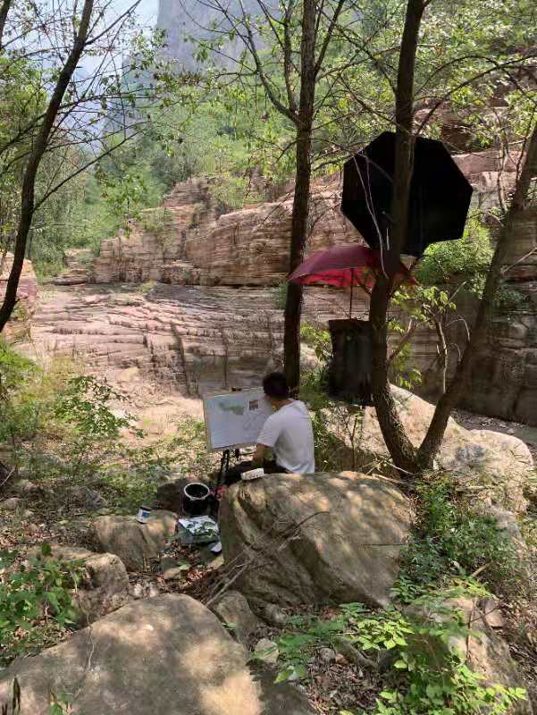 两天的时间游览了太行屋脊、桃花谷、王相岩,感受了北方山谷的峰峦重叠和大自然的力量,大家被大自然的创作所深深吸引,唐代画家张璪说“外师造化,中得心源”。同学们支起画架,将自己对于大自然的敬畏与热爱浓缩在手中的画笔上,在画布上激情创作。