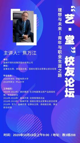 焦万江先生首先做了自我介绍,亲切自然地讲述自己在地大的回忆,与学弟学妹们拉进距离,并且向同学们提出问题——在地大生活中什么最重要,以此来引出今天讲座的主题,也引发同学们思考并参与互动。在听完学生们主动畅谈想法后,焦万江先生阐明讲座的初衷,希望可以分享自己从毕业到美的再到盈峰环境一路走来的经验教训,让同学们少走弯路。