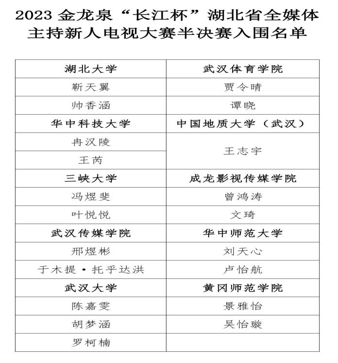 (通讯员:张梅珍宁薇单湉艺)11月11日下午,2023金龙泉“长江杯”湖北省全媒体主持新人电视大赛传来喜讯,我院新闻传播系22级本科生王志宇荣获银奖,新闻传播系21级本科生赵佳桐和22级本科生赵大宇荣获入围奖,中国地质大学(武汉)荣获组织奖。