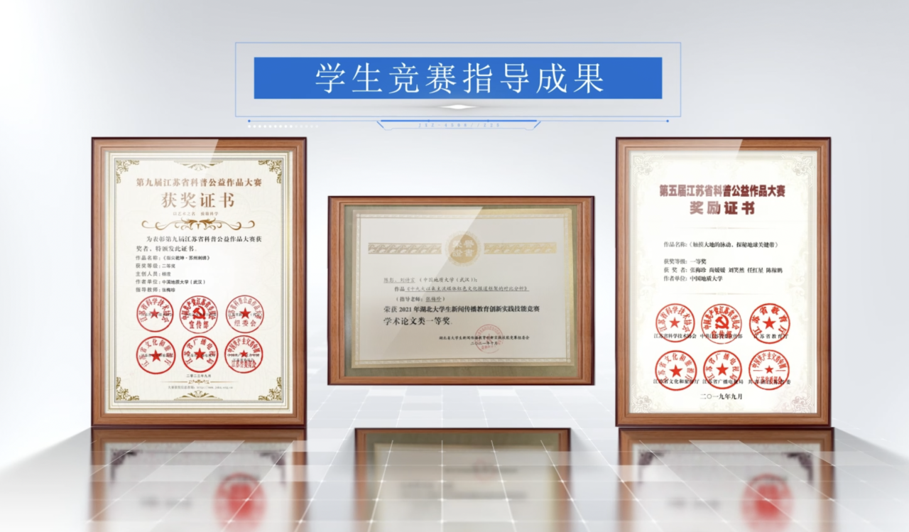 学生苏慧在参与课题研究方面基础厚实,就吸纳她参与导师社科基金等重要课题进行调研、学术交流等,该同学现已在地大攻读博士学位,发表多篇T2论文;曹欣怡、陈欣在学术论文写作方面具备潜质,就带领他们从选题、文献、方法和写作技巧等方面加以训练,发表多篇T3等级别论文;陈佳玥、熊雅雯在专业实践和艺术创作方面独具优势,通过各种专业竞赛、大型活动、科普宣传等完成了一系列科普视频、宣传片以及各种大赛作品,多次获国家级、省级大学生广告艺术大赛、科普微视频大赛奖项。
