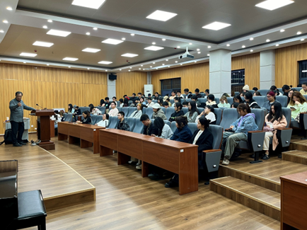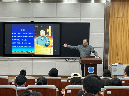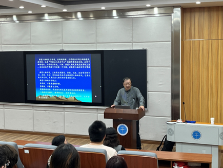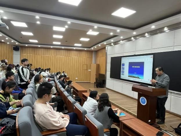 新闻传播系主任宁薇主持讲座。她介绍了陈国栋的简历。他是中国行业报协会名誉副会长,原中国自然资源报社社长。中国自然资源作家协会主席,中国作家协会第十届全委会委员,《大地文学》主编,中国地质大学(北京)高级研究员、文学创作中心主任。中国地质大学(武汉)客座教授。先后在《人民文学》《中国作家》《北方文学》《东方文学》《中国自然资源报》《中国矿业报》《中国水利报》《中国移民管理报》等报刊发表新闻通讯、报告文学、散文、评论二百万字。报告文学《地球印记》获2022年度《人民文学》奖。