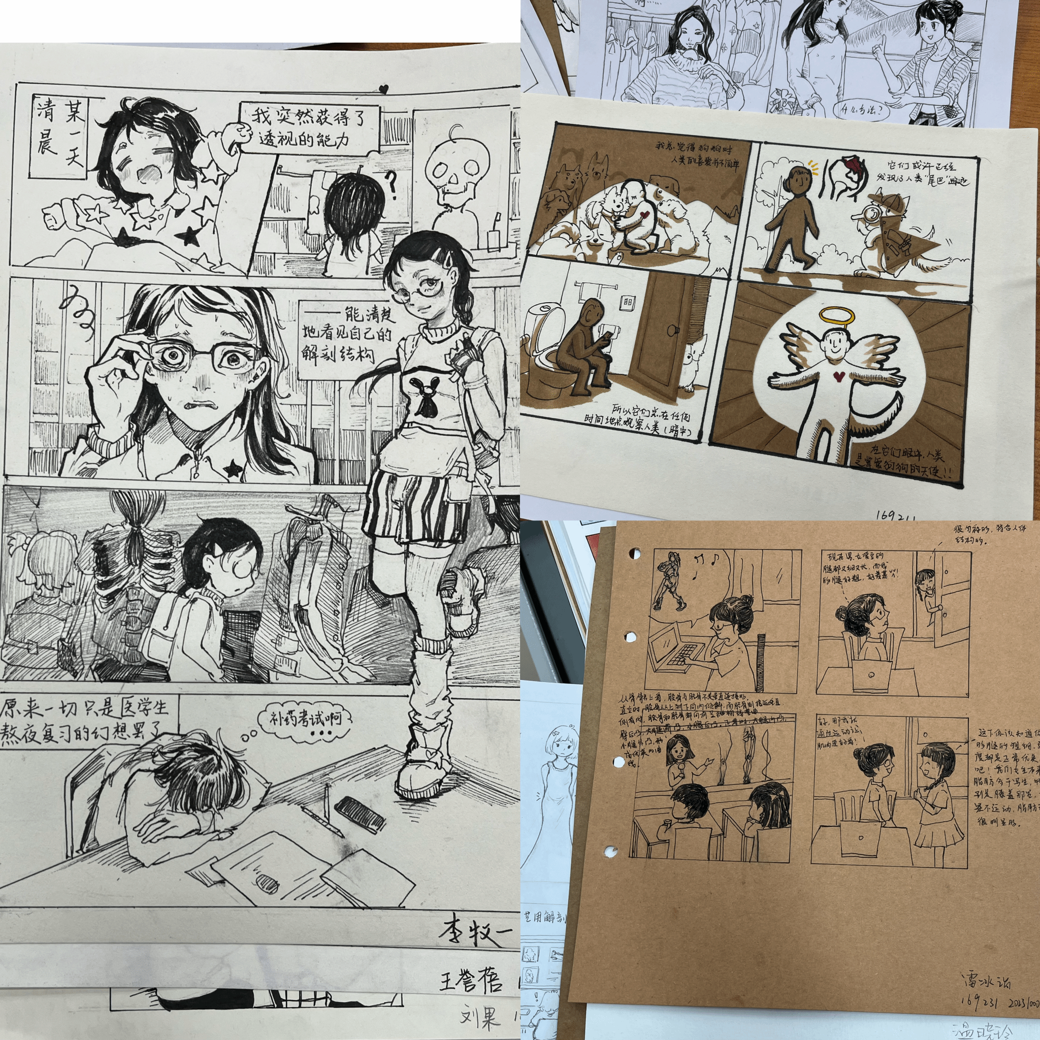 课程作业分为几个部分:艺用人体解剖、结课考察四格漫画、展览观后感、然后把这些内容装订成一本手工书。这样不仅是对人体解剖知识的学习,同时将数字媒体专业基础课程与后续艺术设计课程紧密结合,对教学进行了有趣的尝试,全方位展示本专业的教学内容和成果。