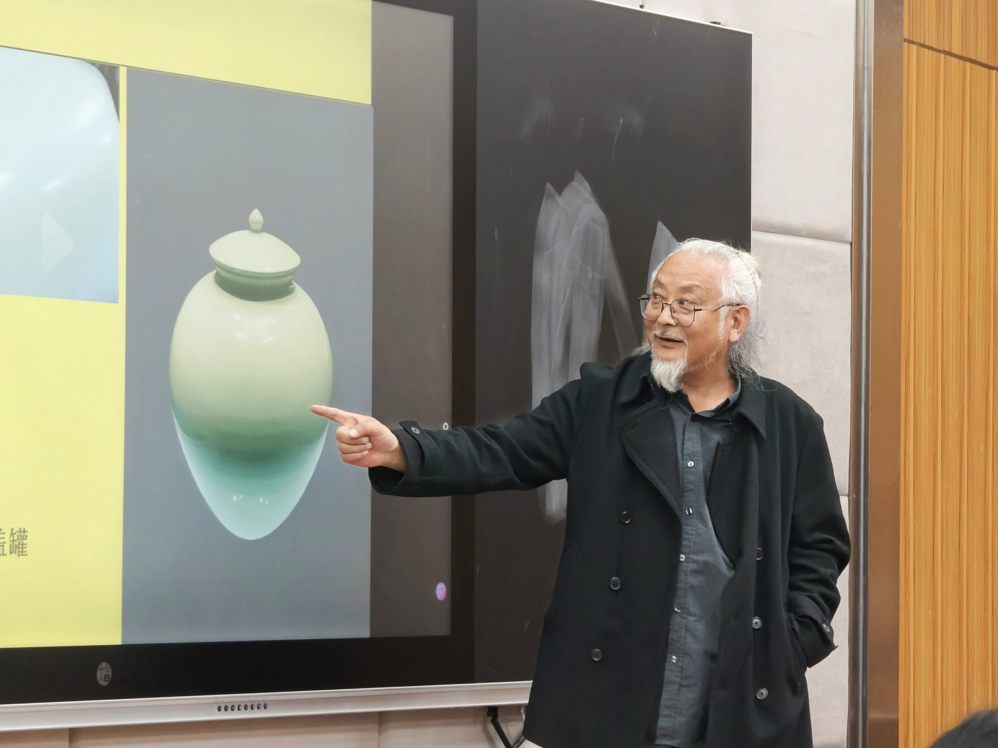 王梦林教授先引领我们欣赏了意大利罗马美术学院艺术家王者先生的油画,分析了不同国家生产的白色颜料在画面中的辨识作用,并推断出白色的审美意义,从白色元素联想到纯洁、月色、白玉等多重寓意,进而引出“陶衣”既釉的产生及南北制瓷文化和审美的差异:北方釉色崇白,南方则尚青。他结合案例图片分享了历代白釉瓷器审美的演变,与自己多年来的收藏心得。其语言幽默、平实却满载着对古瓷的深情厚爱,让我们受益匪浅。