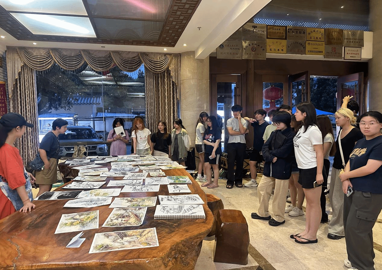 在为期12天的实习中,同学们深入理坑古村,对当地历史建筑进行细致观察与研究,感悟徽派建筑的独特韵味,汲取艺术灵感。大家支起画板,就当地的风景进行写生绘画,用画笔捕捉白墙黛瓦的错落之美,描绘山水田园的诗意风光,将自然之美与艺术创作紧密相连。