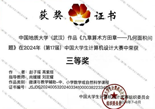 在2024年(第17届)中国大学生计算机设计大赛决赛中,由我院教师指导的参赛队伍获得1项国家级三等奖,3项中南赛区一等奖、3项中南赛区二等奖、3项中南赛区一等奖。2021级广电专业的高紫烜和赵子瑶创作的作品《九章算术方田章》参与了在沈阳进行的国赛决赛并获得了微课类三等奖。该场决赛共吸引了来自厦门大学、武汉大学、四川大学、哈尔滨工业大学、华中科技大学、中国人民大学、东北大学等全国490所高校的885件作品参赛。
