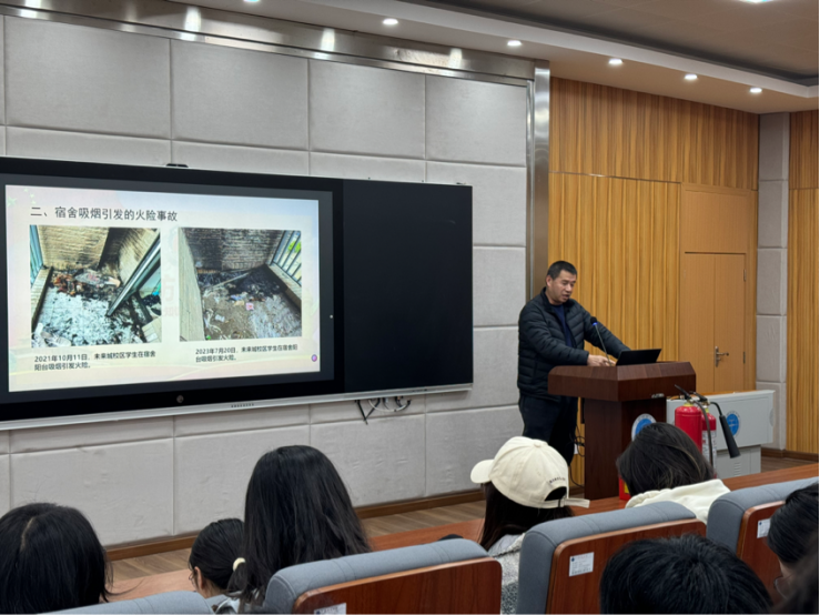 邀请了学校安全保卫部消防科科长刘从贵老师在1104报告厅面向学院全体本研学生骨干做关于消防安全的主题讲座。学工组全体专兼职辅导员参加本次活动,讲座由学生会秘书部潘爱一主持。