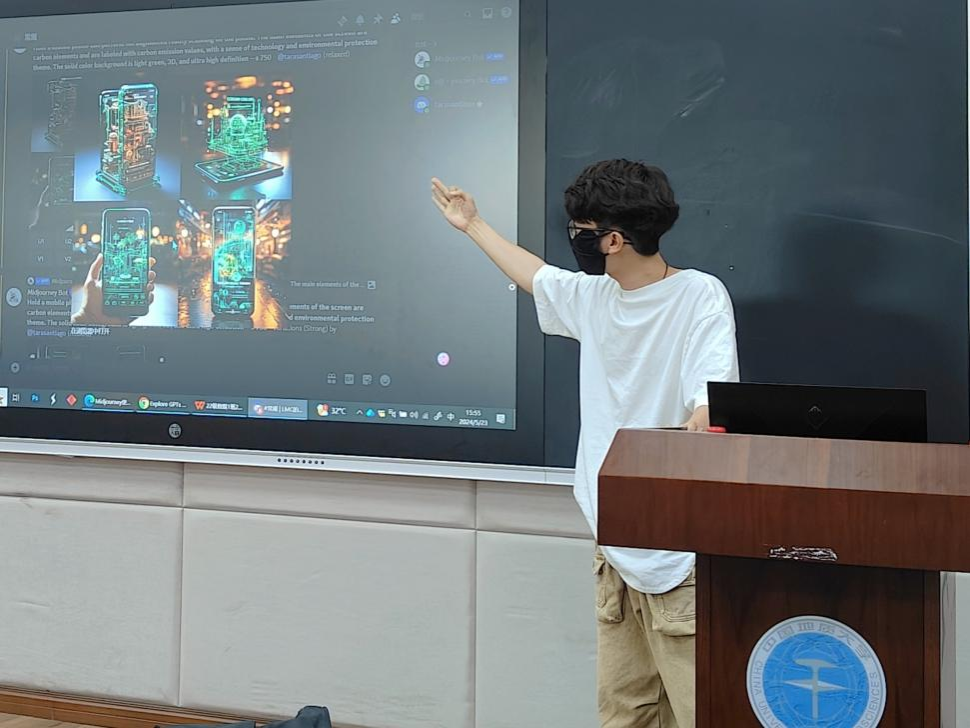 接着,刘淼聪介绍了人工智能绘画工具Midjourney,并详细解释了其在图片生成和艺术创作领域的应用之广。他不仅演示了工具的使用方法,还分享了大量实际经验和技巧,激发了同学们对人工智能技术的兴趣和探索欲望。