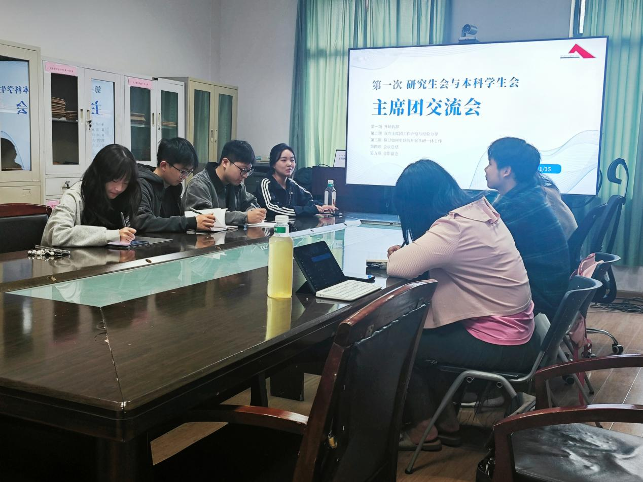 在艺媒楼1212召开第一次本研主席团交流会。会议由学生会主席金煦婷主持,学生会主席团成员及研究生会主席团成员共同参与此次会议。