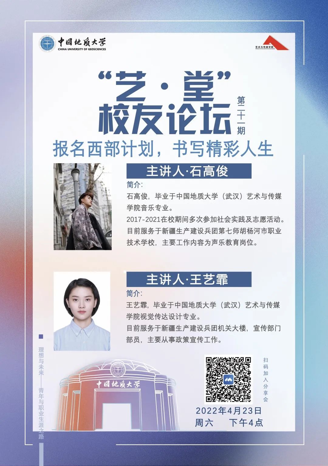 第二十一期“艺·堂”校友论坛“报名西部计划,书写精彩人生”讲座活动顺利进行,由我院音乐专业毕业生石高俊和视觉传达设计专业毕业生王艺霏主讲。