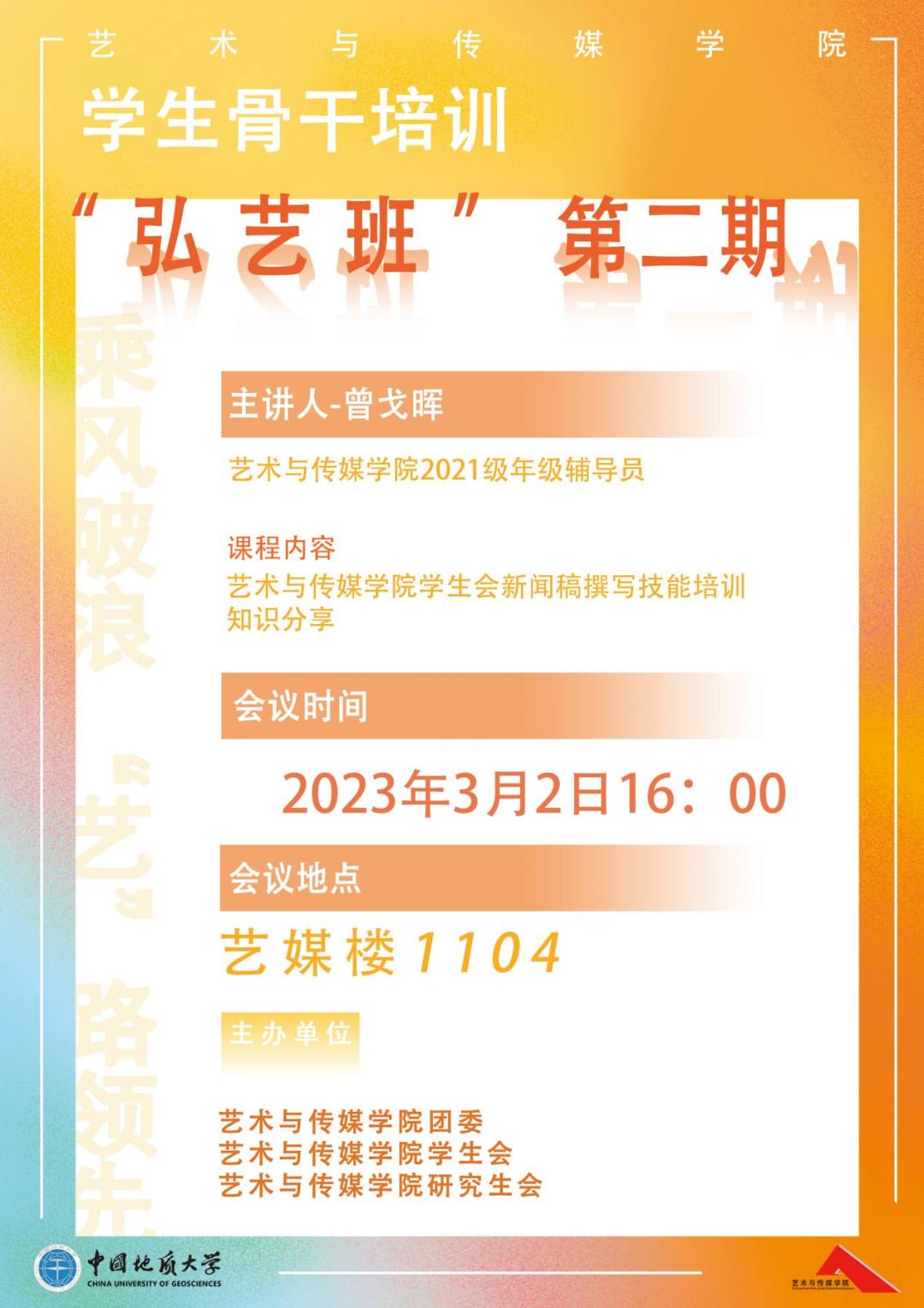 2023年第二期“弘艺班”学生骨干培训在艺媒楼1104报告厅顺利展开,学院研究生会和学生会的全体学生干部参加了本次培训,培训由我院学工组辅导员曾戈晖老师主讲。