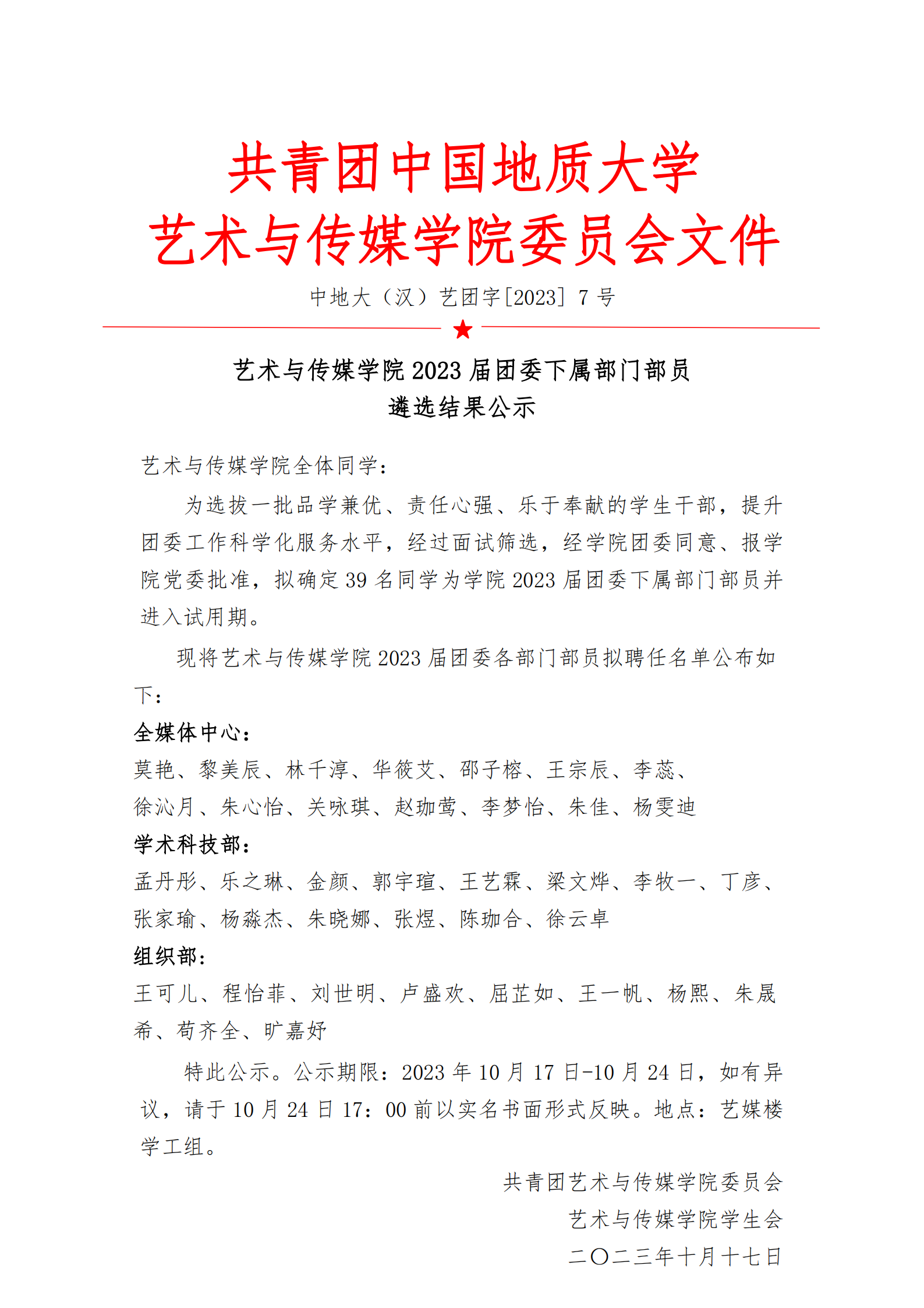 通知 | 好色tv 2023届团委下属部门部员遴选结果公示