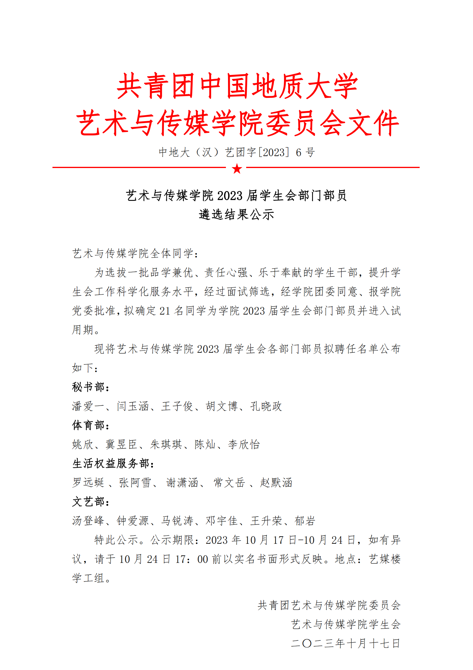 通知 | 好色tv 2023届学生会部门部员遴选结果公示