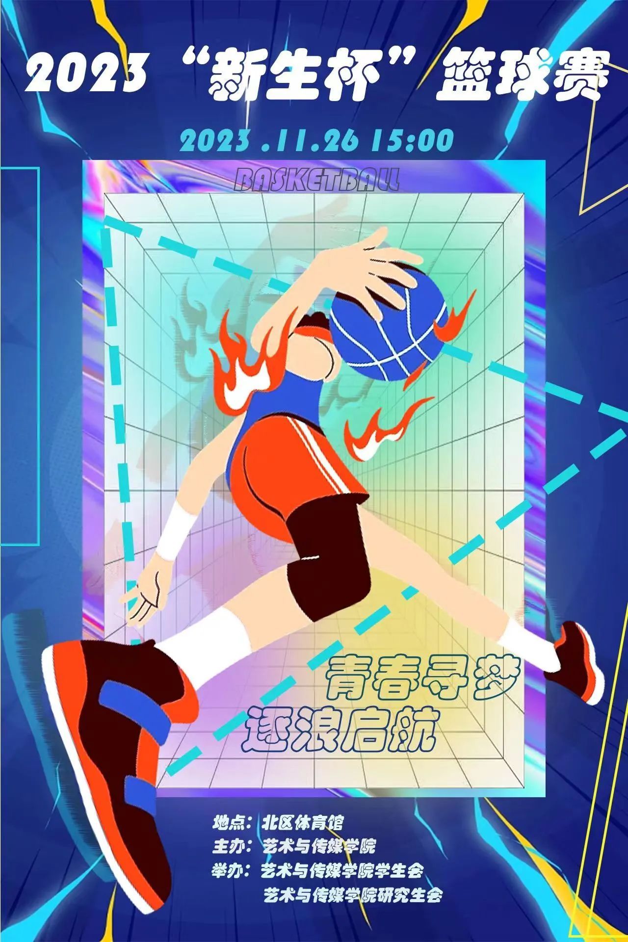 2023“新生杯”篮球赛于北区体育馆举行,第一场比赛由来自学院的研究生代表队作战大一代表队,裁判由篮球裁判社成员担任,学工组辅导员曾戈晖到场观赛。