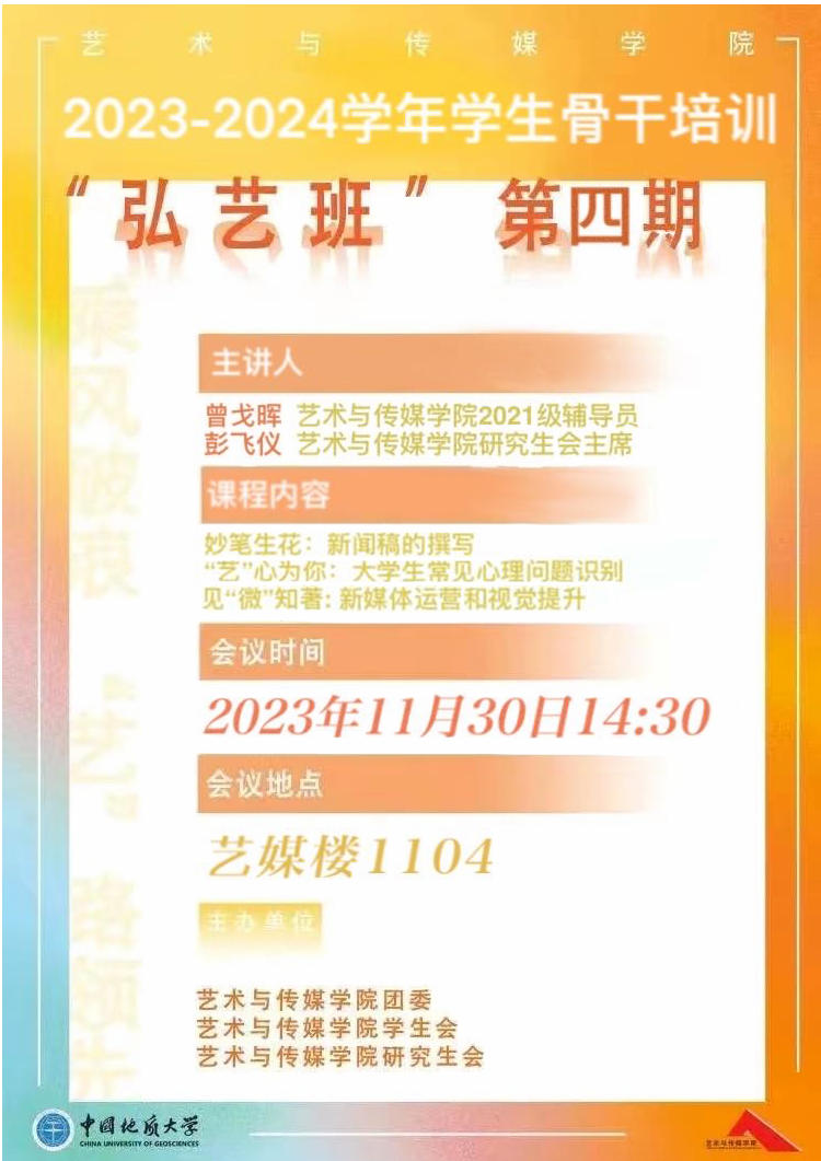 学生骨干培训“弘艺班”第四期于线上腾讯会议顺利开展。本次培训由学院学工组辅导员曾戈晖、研究生会主席团成员彭飞仪主讲,学院学生会和研究生会全体成员参加本次培训,培训的主要内容为:新闻稿的撰写、大学生常见心理问题识别以及新媒体运营和视觉提升。