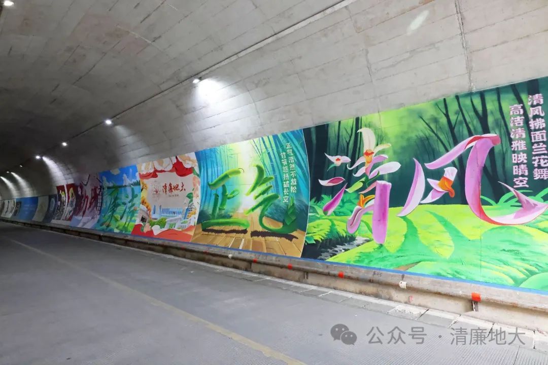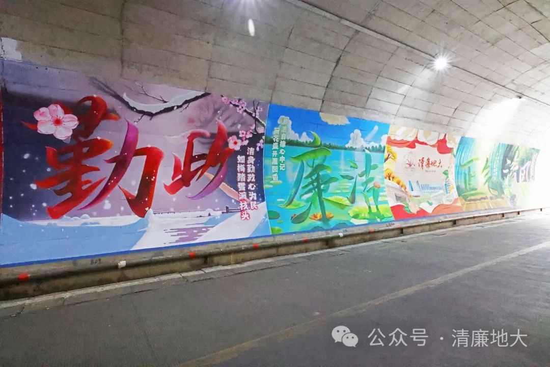 在美丽的校园里,连通西区和北区校园的地大隧道是不少师生课间往返的必经之路。最近,有这样几幅壁画令人眼前一亮:以梅花、荷花、兰花和竹子为意象,组成的“勤政”“廉洁”“清风”“正气”四幅画,围绕在“清廉地大”主图的周围,色彩鲜明,寓意深刻。壁画长22米,高3米,由我校好色tv