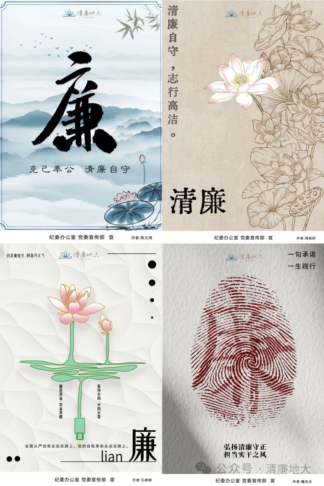 与此同时,我校纪委办公室和党委宣传部遴选了一批由学生设计的廉洁文化作品,印制成宣教海报,张贴在教学楼、图书馆、学生宿舍等场所。据悉,2022年9月至10月,我校举办了首届廉洁文化宣传设计大赛,引导鼓励师生将廉洁文化“从心间画到笔尖”。比赛累计收到师生原创作品300余件,最终精选出70件作品集结出版《画说清廉——清廉地大文创作品集》。此次的宣教海报素材就来源于此。